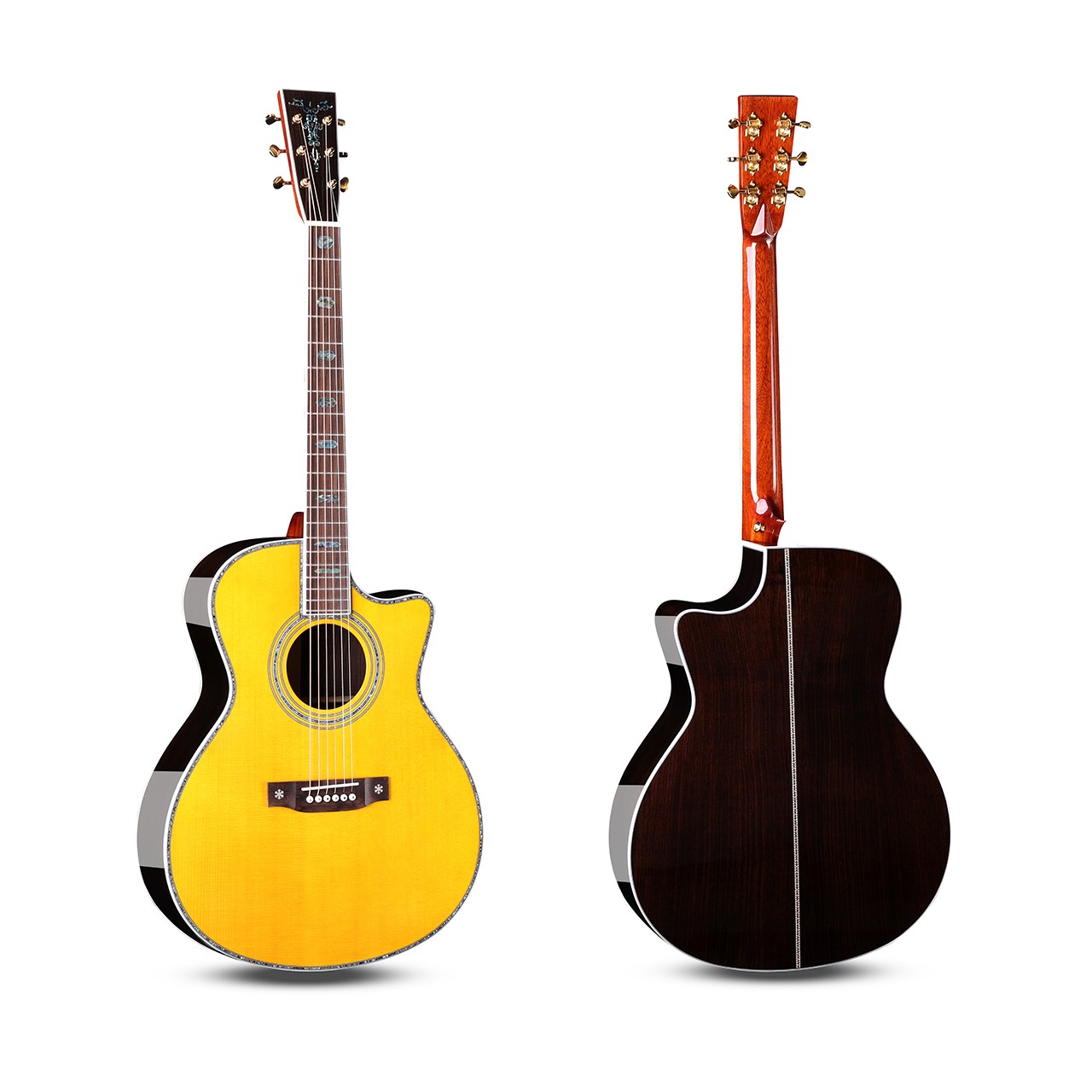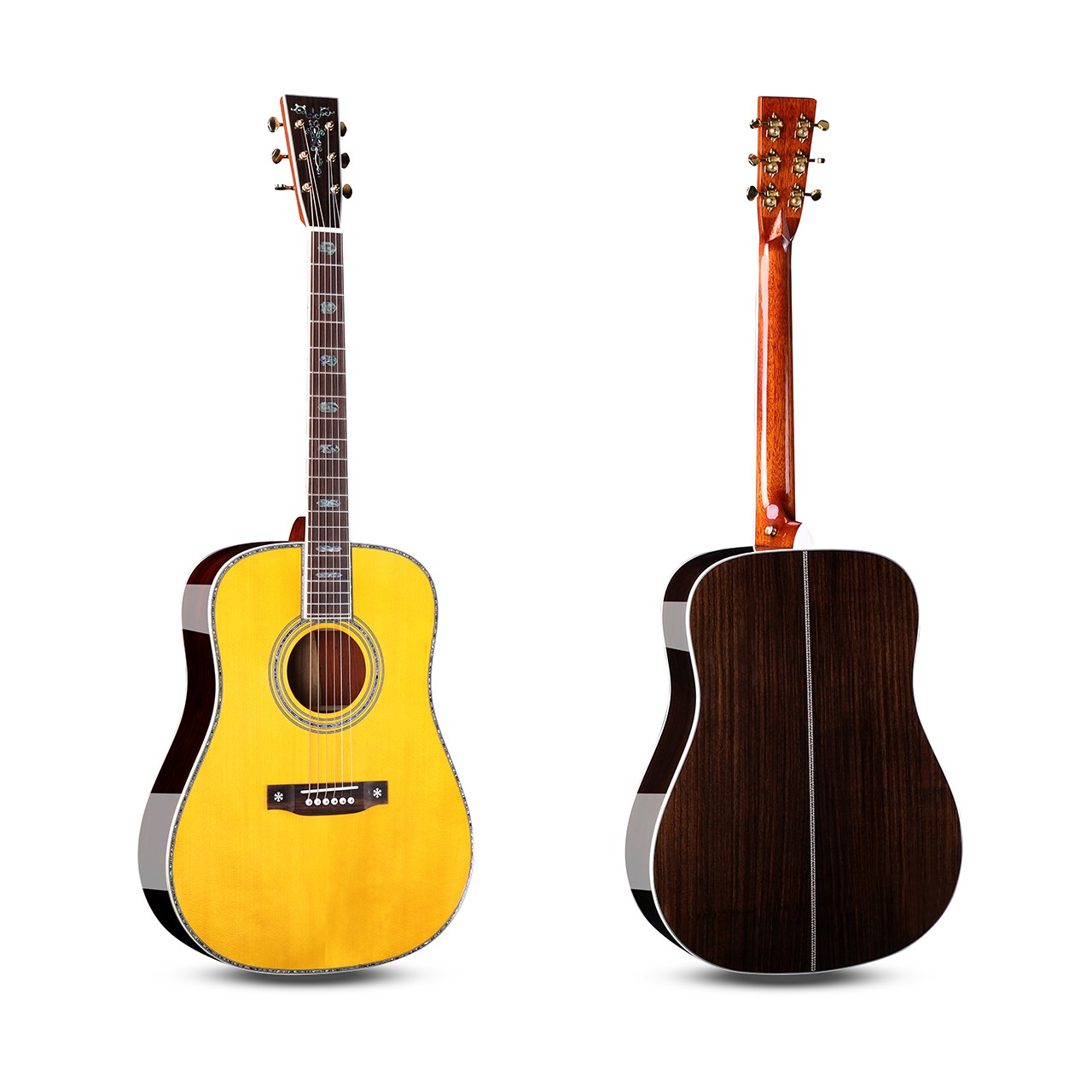 尺寸:41寸D桶&OM桶&GA桶 面板:A级云杉单板 背侧板:印度玫瑰木单板 面镶边:深海鲍鱼贝 琴颈:桃花芯 指板:玫瑰木 (镶嵌贝壳) 琴弦:磷铜镀膜-高抗氧化 琴钮:开放式高精度金色弦扭 琴枕:牛骨 油漆:高清亮光