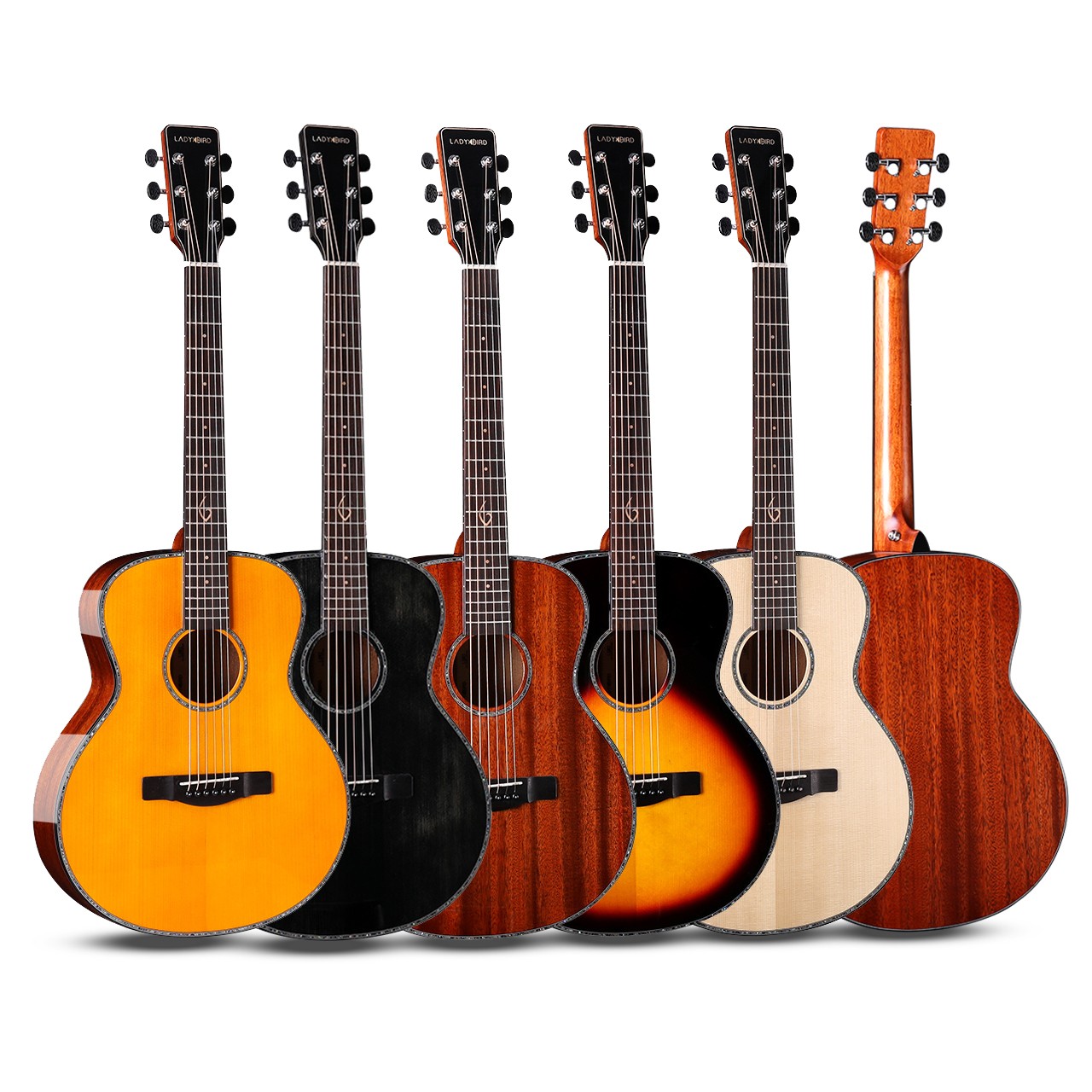型号:LGM2 尺寸:36寸 面板:云杉单板/桃花芯单板 背侧板:桃花芯单板 口轮花:鲍鱼贝 镶边:鲍鱼贝 弦钮:全封闭弦扭 琴弦:磷铜-高抗氧化 指板:玫瑰木(枫木镶嵌“初心”) 油漆:亮光