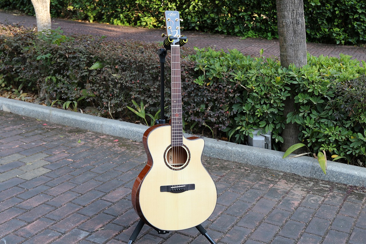 型号:DW-230G 尺寸:41寸 面板:A+欧洲云杉单板 背侧板:刚果虎纹桃花芯 口轮花:鲍鱼珍贝 弦钮:1:19镀金封闭式 指板:手工镶嵌(星瀚) 品丝:圆头品丝(无痛0品) 臂托:实木臂托 油漆:高清亮光 梁架:手工研磨