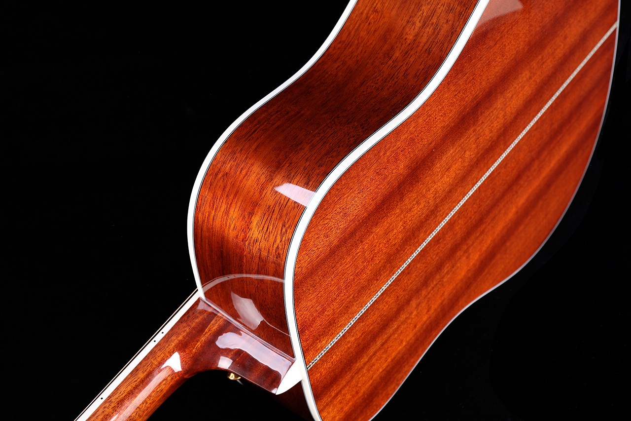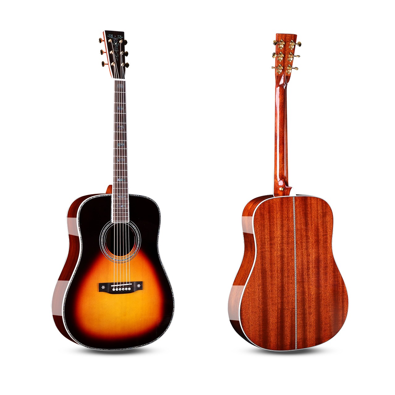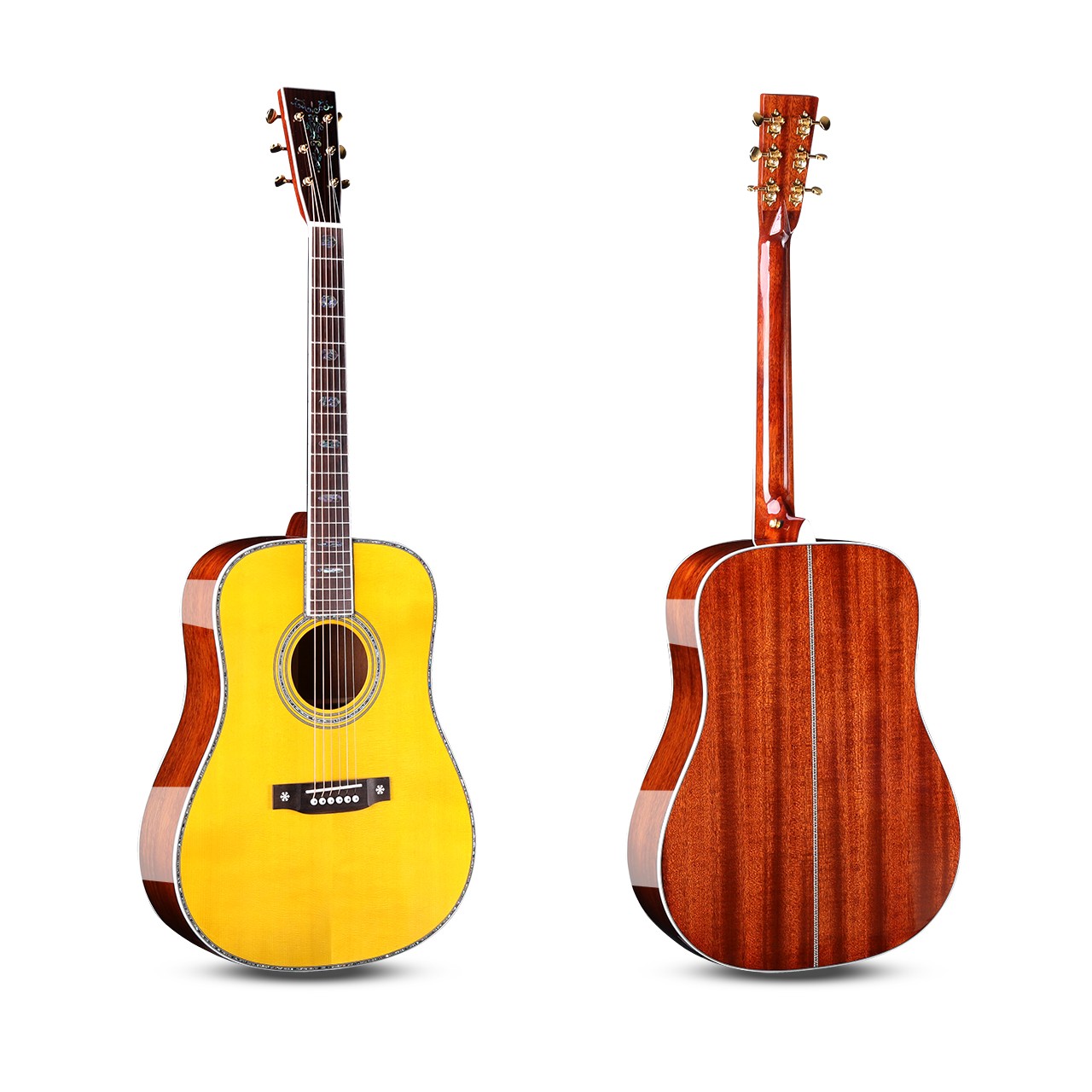 尺寸:41寸D桶 面板:A级云杉单板 背侧板:非洲桃花芯单板 面镶边:深海鲍鱼贝 琴颈:桃花芯 指板:玫瑰木 (镶嵌贝壳) 琴弦:磷铜镀膜-高抗氧化 琴钮:开放式高精度金色弦扭 琴枕:牛骨 油漆:高清亮光
