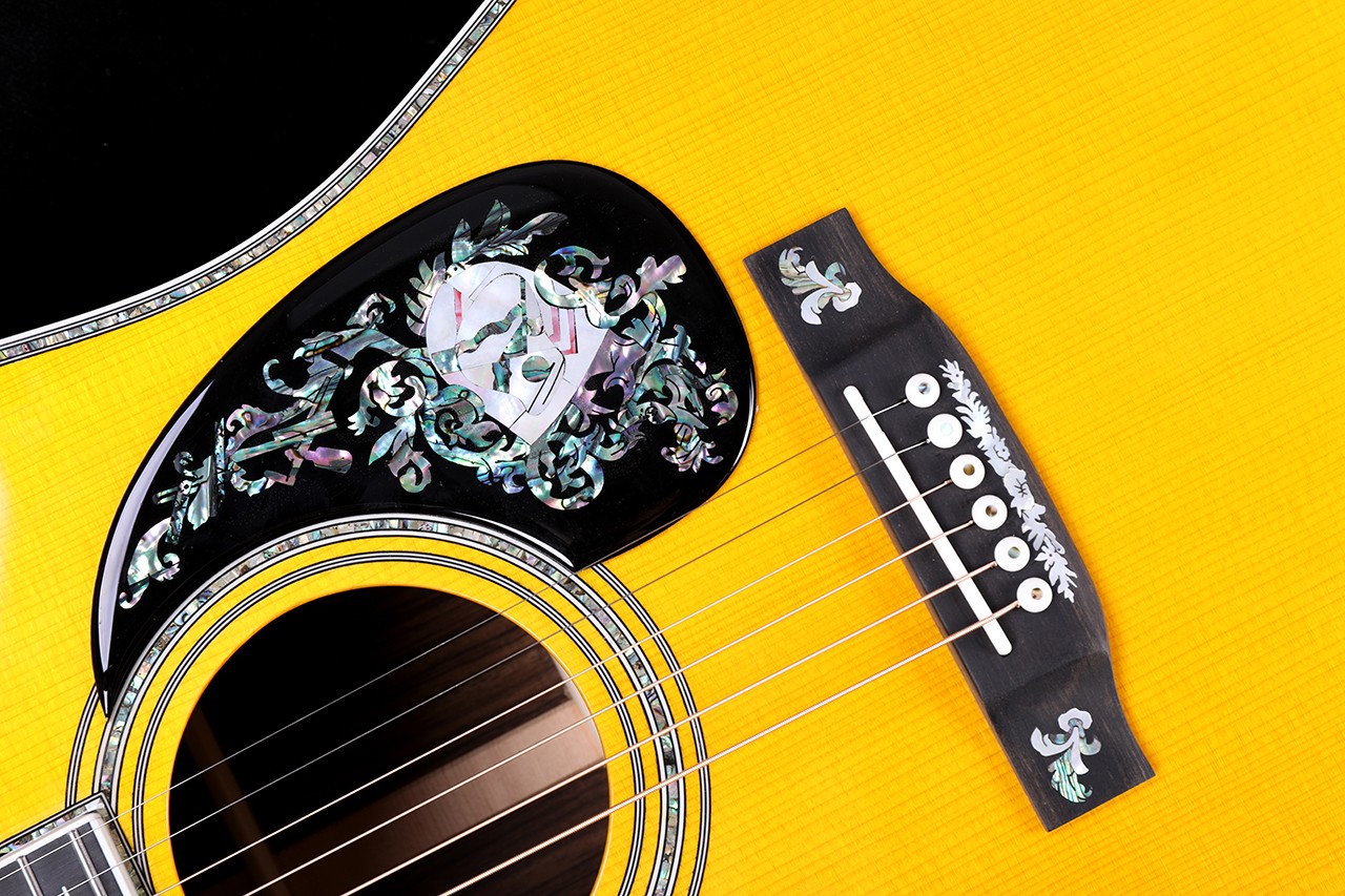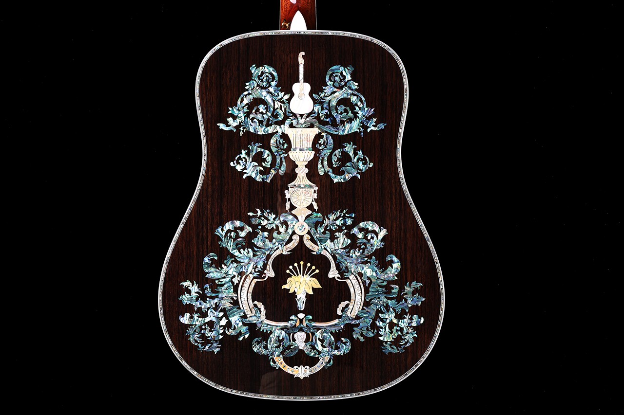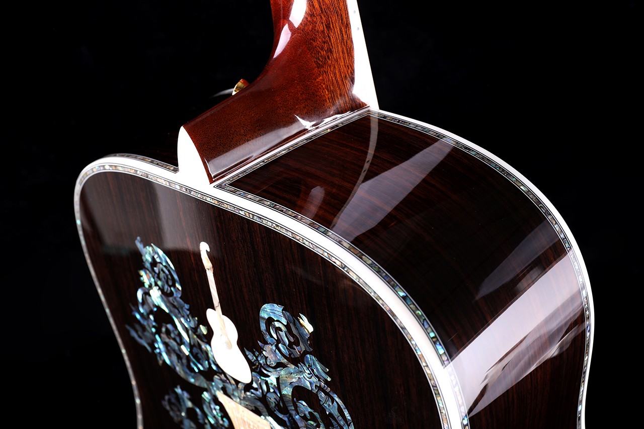 尺寸:41寸D桶 面板:AA级云杉单板 背侧板:AA级印度玫瑰木单板 镶边:面/背/侧板奢华镶嵌鲍鱼贝 琴颈:桃花芯 指板:乌木(原贝镶嵌) 琴弦:达达里奥-XS1253 琴钮:浮雕金色开放式(台湾德荣) 琴枕:牛骨 油漆:高清亮光