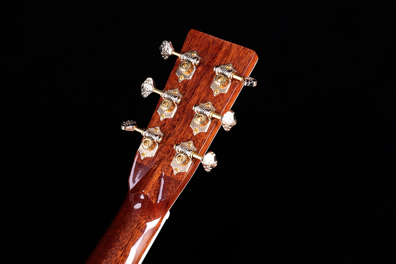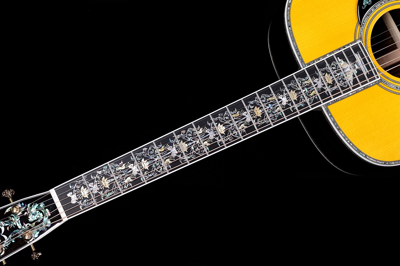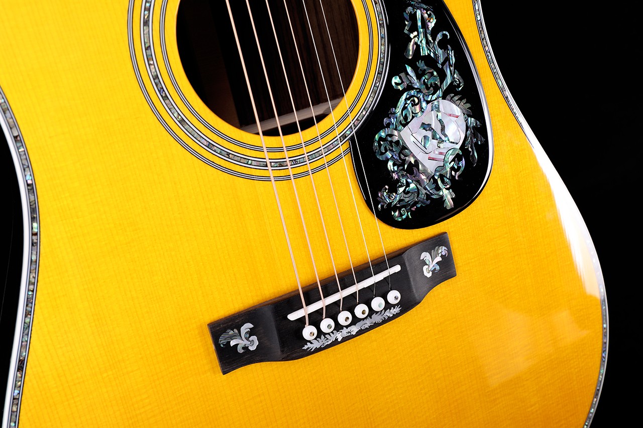 尺寸:41寸D桶 面板:AA级云杉单板 背侧板:AA级印度玫瑰木单板 镶边:面/背/侧板奢华镶嵌鲍鱼贝 琴颈:桃花芯 指板:乌木(原贝镶嵌) 琴弦:达达里奥-XS1253 琴钮:浮雕金色开放式(台湾德荣) 琴枕:牛骨 油漆:高清亮光