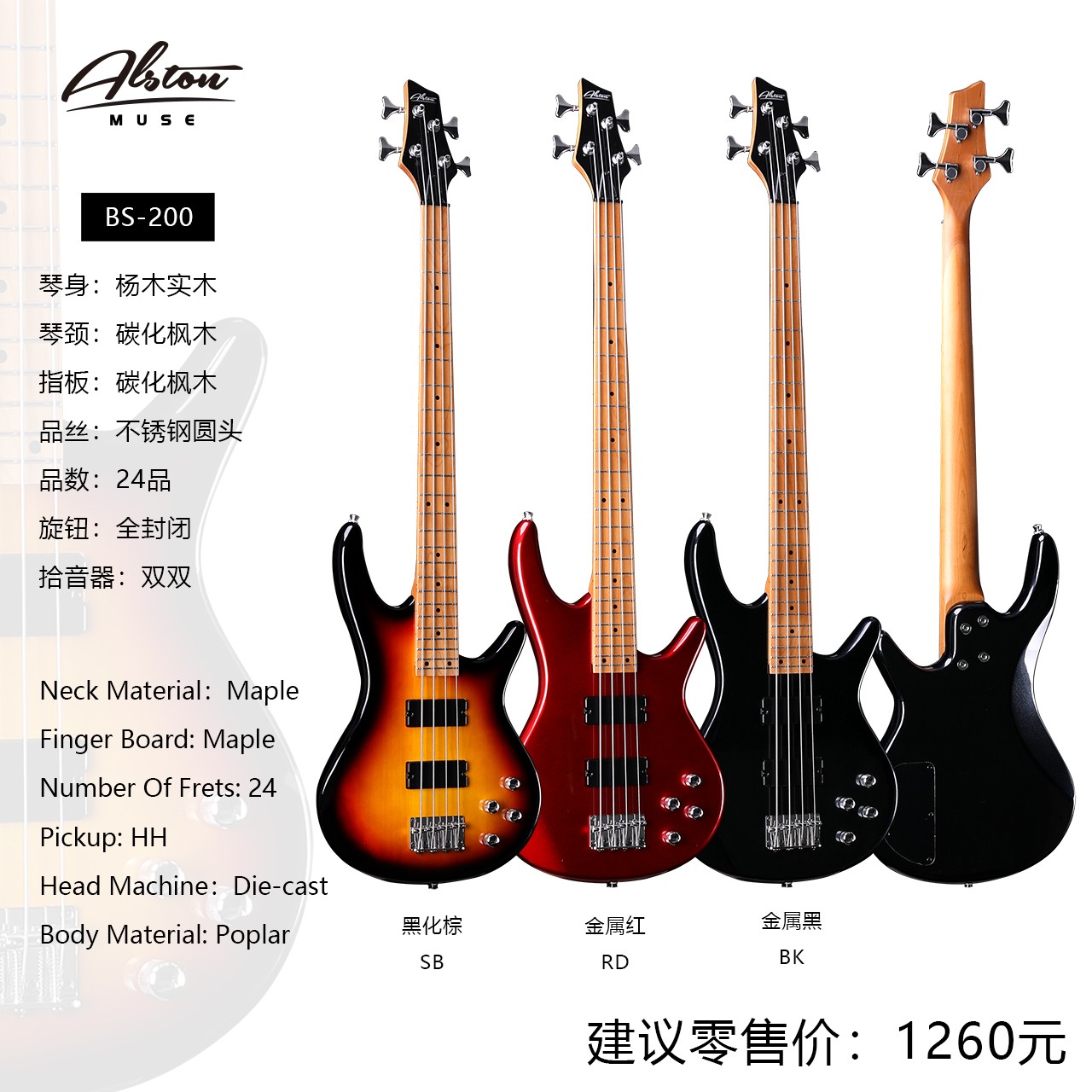 琴身:杨木实木 琴颈:碳化枫木 指板:碳化枫木 品丝:不锈钢圆头 品数:24品 旋钮:全封闭 拾音器:双双