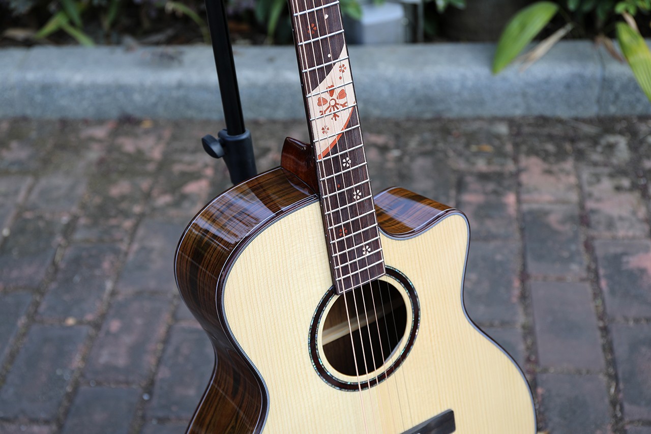 型号:DW-220 尺寸:41寸 面板:A+西提卡云杉单板 背侧板:巴西彩蝶木 口轮花:鲍鱼珍贝 弦钮:19齿镀金高精度 指板:手工镶嵌 品丝:圆头品丝(无痛0品) 臂托:实木臂托 油漆:高清亮光 梁架:手工研磨