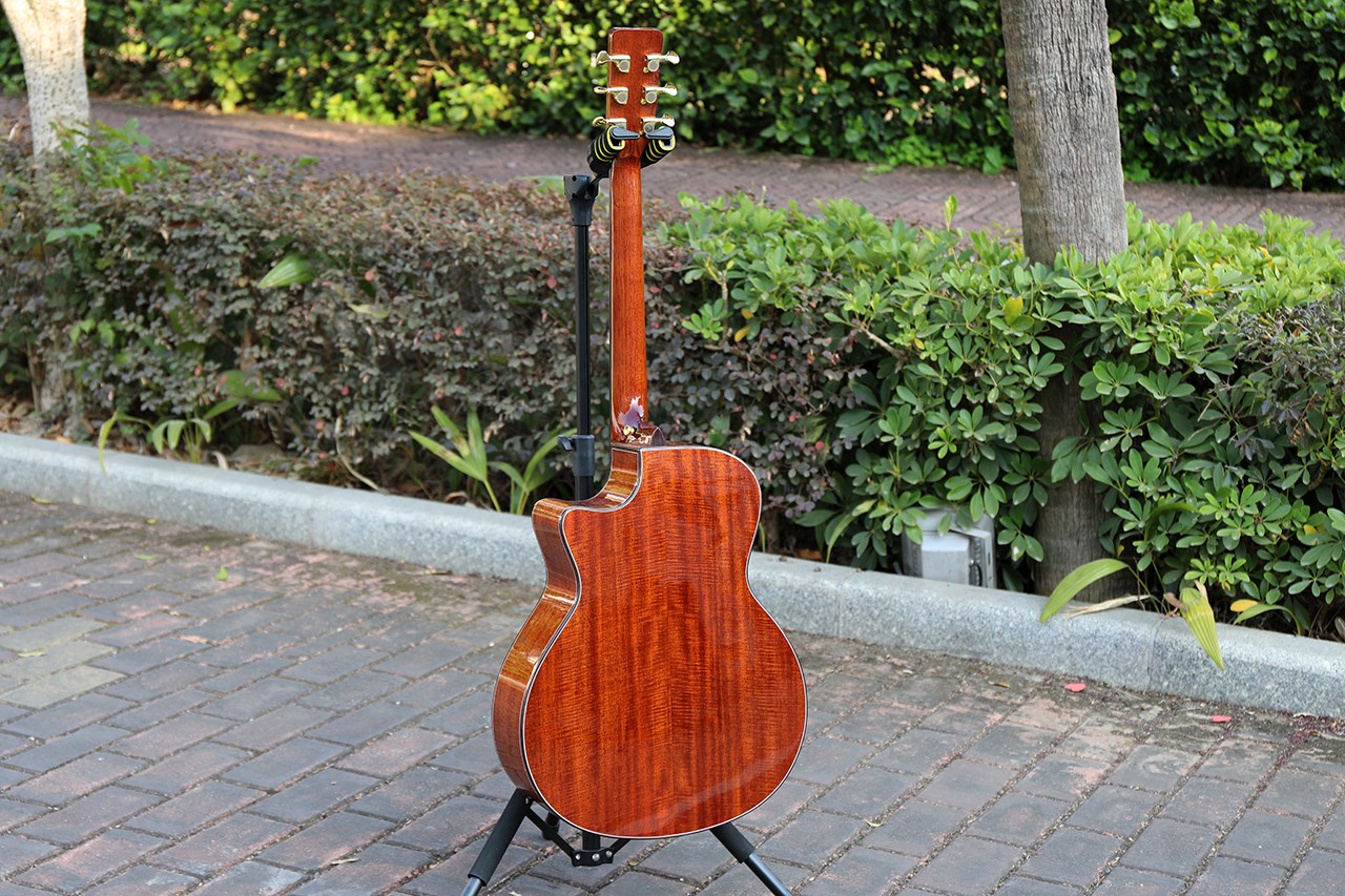 型号:DW-230G 尺寸:41寸 面板:A+欧洲云杉单板 背侧板:刚果虎纹桃花芯 口轮花:鲍鱼珍贝 弦钮:1:19镀金封闭式 指板:手工镶嵌(星瀚) 品丝:圆头品丝(无痛0品) 臂托:实木臂托 油漆:高清亮光 梁架:手工研磨