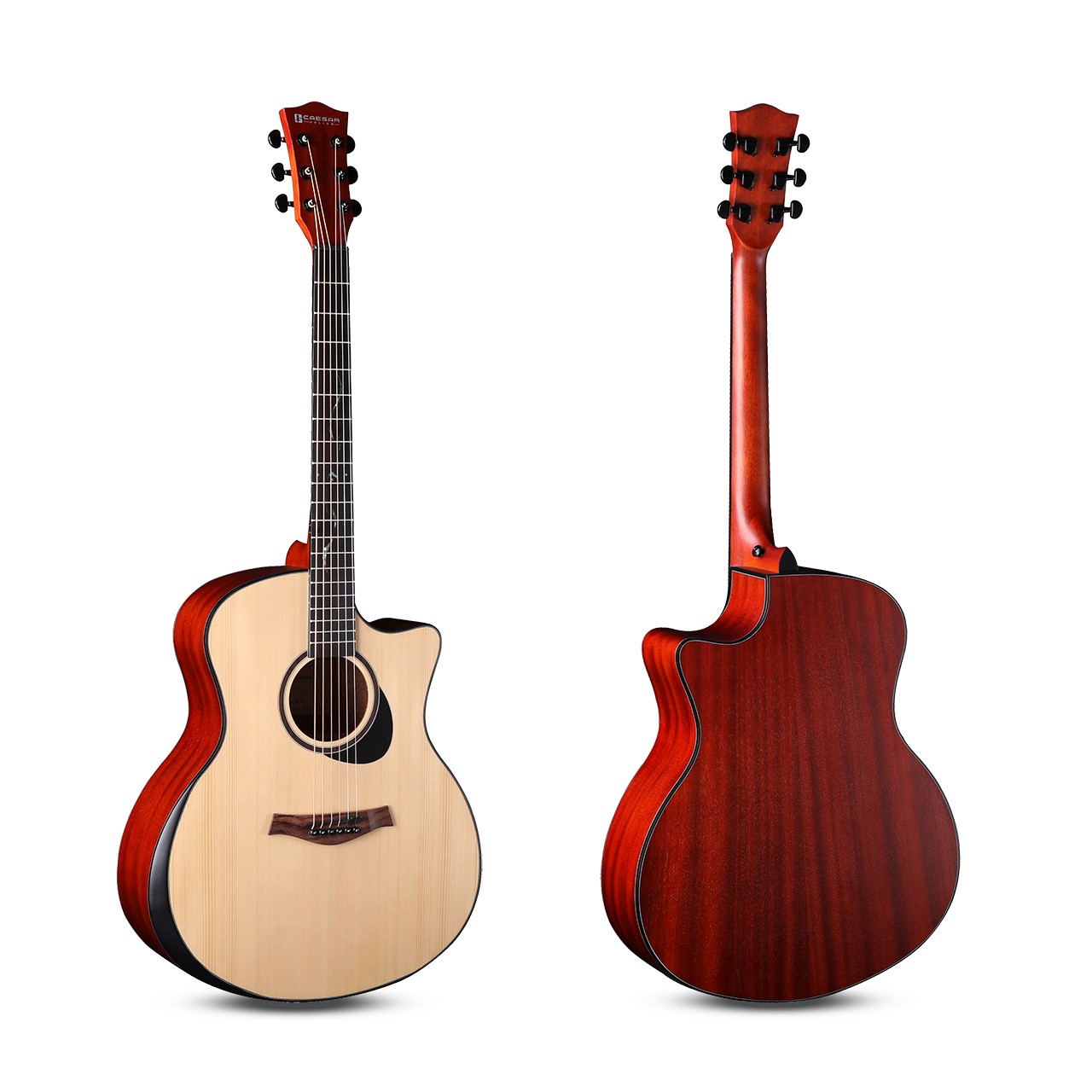 型号:WL-850 尺寸:41‘’ 面板:云杉单板 背侧板:沙比利 口轮花:仿木水转印 镶边:ABS+五线 弦钮:全封闭准 指板:科技木 油漆:哑光 臂托:斜面靠手